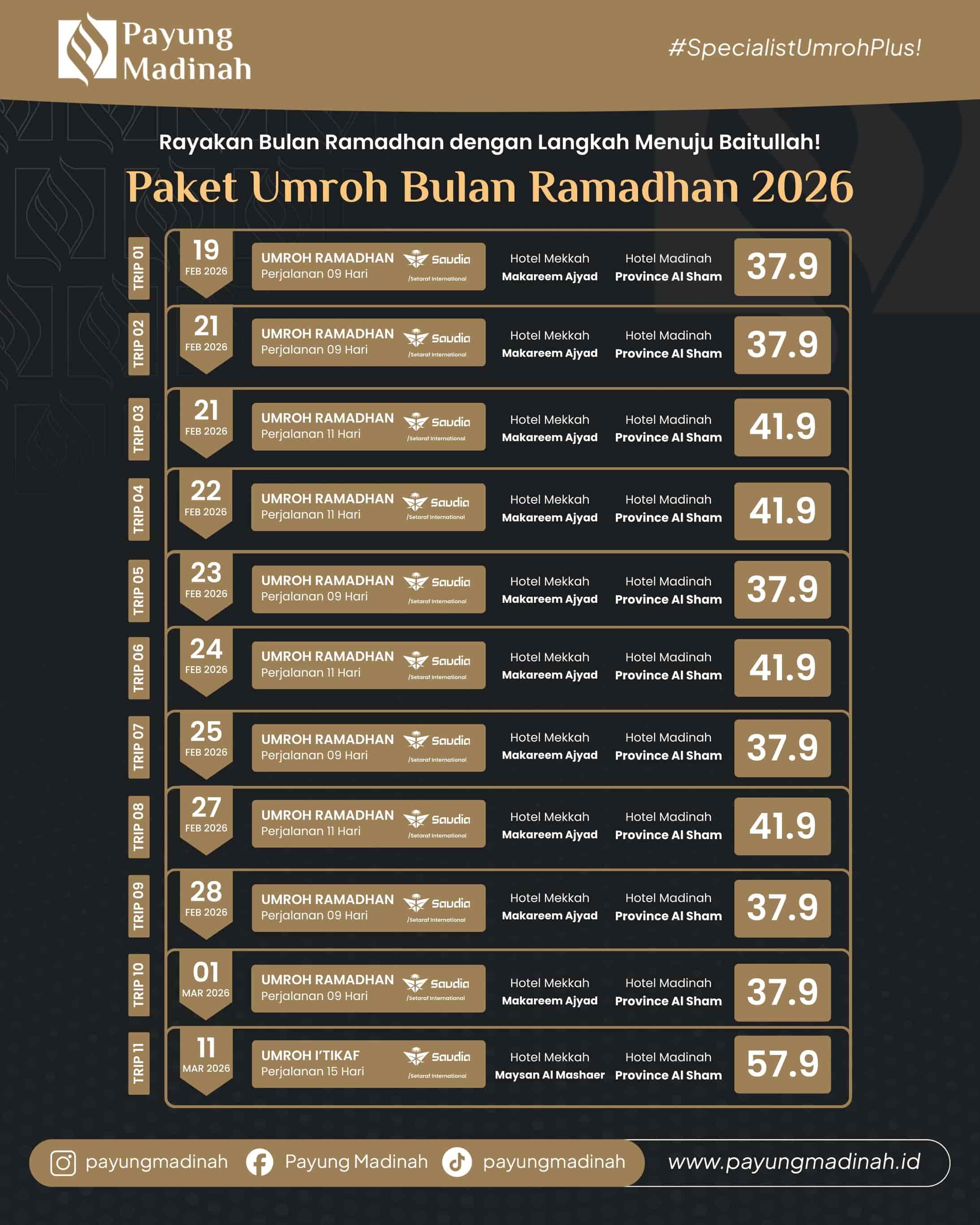 Rasakan Kenyamanan dalam menjalankan ibadah umroh dengan Program Umroh Bersama Payung Madinah Tour Plus.